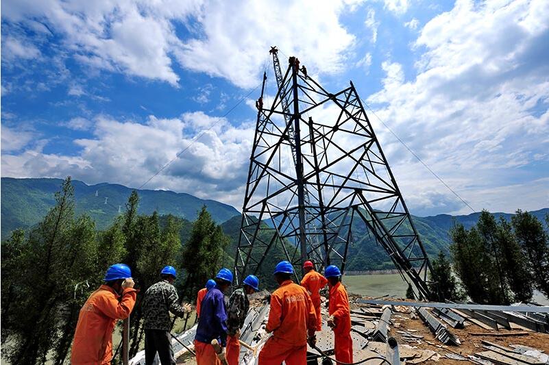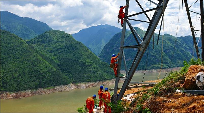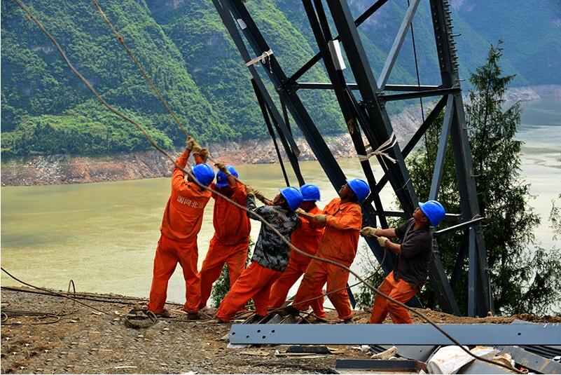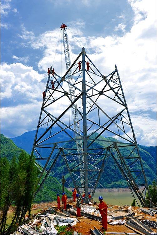 在酒湖±800千伏特高壓湖北恩施州巴東段,北京送變電公司員工正在長江北岸組立跨江5535號鐵塔。