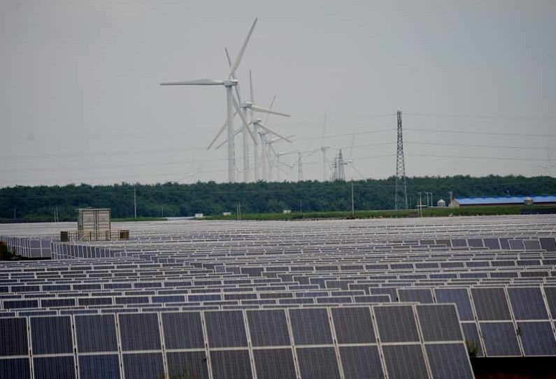 2013年9月5日拍攝的江蘇鹽城市東臺(tái)風(fēng)光漁互補(bǔ)新能源基地。風(fēng)光漁互補(bǔ)是指上有風(fēng)電、中有光電、下有養(yǎng)殖的三層立體收益綜合體。東臺(tái)市充分利用沿海豐富的風(fēng)、光資源,每一分土地實(shí)行立體開發(fā),由中節(jié)能太陽(yáng)能科