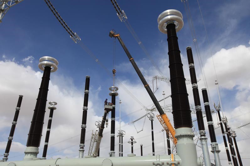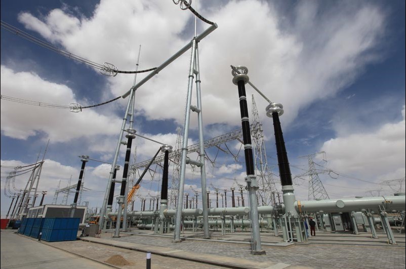 5月8日我們起了一個大早,早早地吃完早餐,拿起各自的采訪行頭,戴著安全帽,跟隨宋新民等人一同來到產(chǎn)品安裝現(xiàn)場進(jìn)行實地采訪。走進(jìn)施工現(xiàn)場,高高的線塔直插云霄,公司生產(chǎn)的6個間隔800千伏全封閉組合電器就像6個巨型方陣,整齊威武地屹立戈壁灘中等待著檢閱。