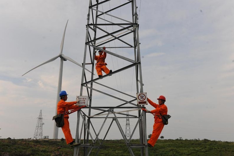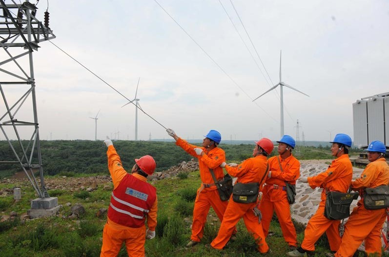2013年7月8日,安徽省明光市電力工程技術(shù)人員在龍源風(fēng)力發(fā)電場為一臺風(fēng)機更換故障電線。當(dāng)日,安徽電網(wǎng)風(fēng)電發(fā)電量累計達10 68億千瓦時,風(fēng)力發(fā)電全部優(yōu)先上網(wǎng)并消納。安徽風(fēng)電每日發(fā)電量達30萬千瓦時,有效緩解