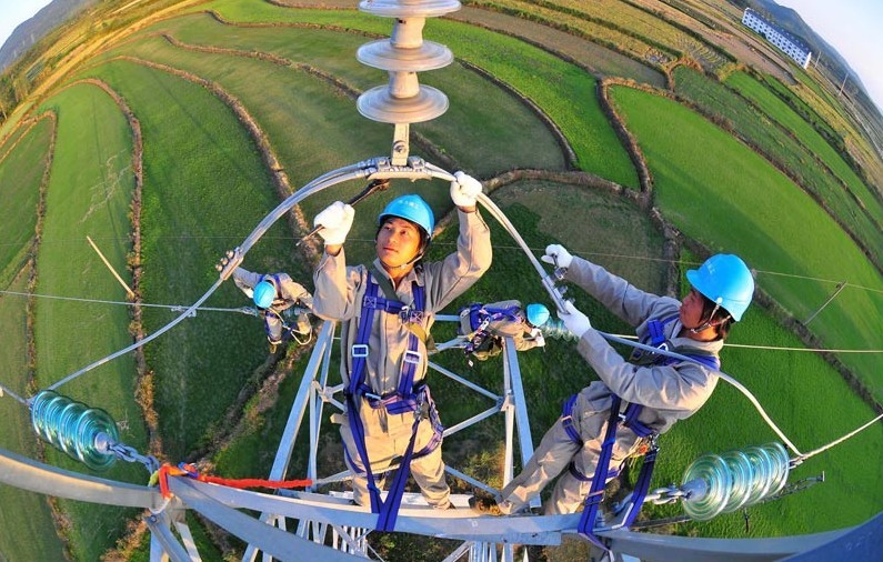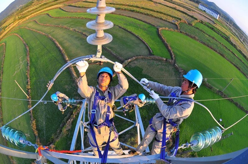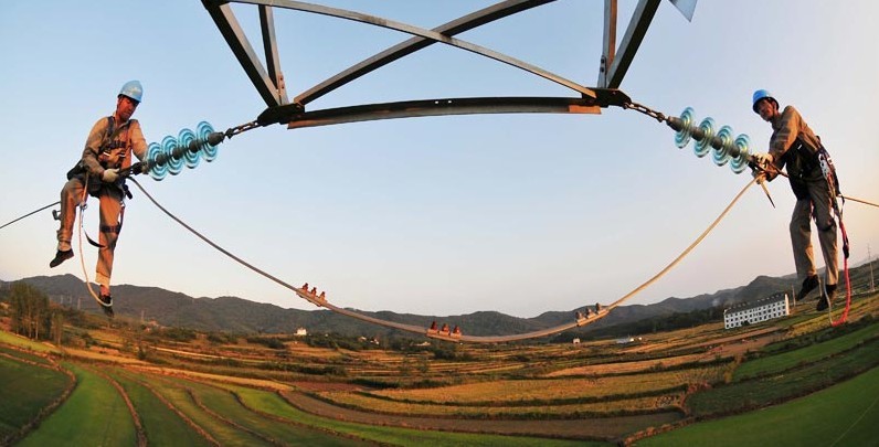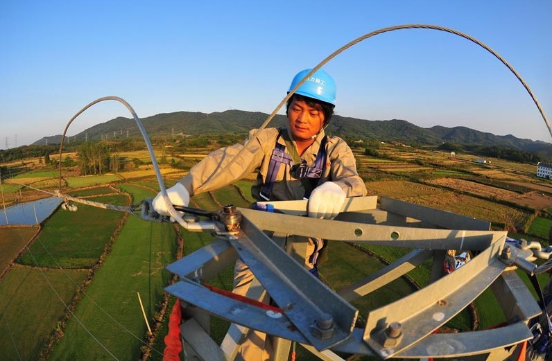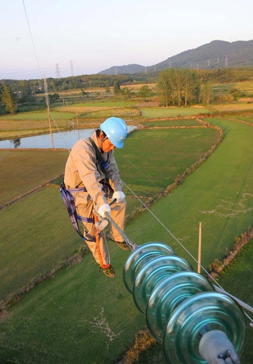 2013年10月1日,在安徽省滁州市南譙區(qū)境內(nèi),電力職工在40多米的高空對(duì)輸電線路進(jìn)行檢修維護(hù)。當(dāng)日是國(guó)慶節(jié),為了讓群眾安度佳節(jié),國(guó)慶十一長(zhǎng)假期間,安徽省滁州市共有1100余名電力職工主動(dòng)放棄休假,堅(jiān)守一線崗