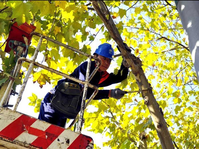 棲霞市城區(qū)供電線路共有11條,線路總長(zhǎng)110多公里,線路下面大多是美化環(huán)境的柳樹(shù)、楊樹(shù)、松樹(shù)和法國(guó)梧桐,這些樹(shù)木在園林人員的澆灌下,成長(zhǎng)迅速,有的高度達(dá)10余米,嚴(yán)重威脅著線路的健康運(yùn)行。由于高度高,直徑細(xì),人員根本無(wú)法攀登,于是他們用專用工程車,及時(shí)派專人清理這些樹(shù)木。