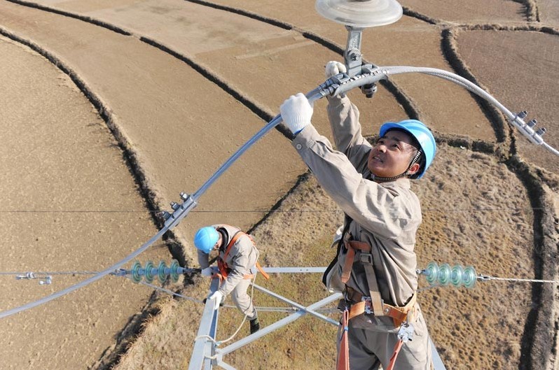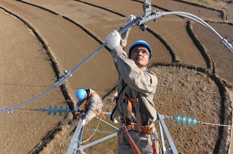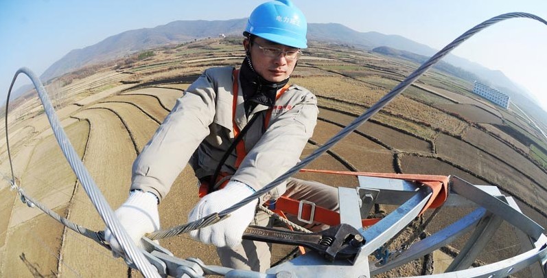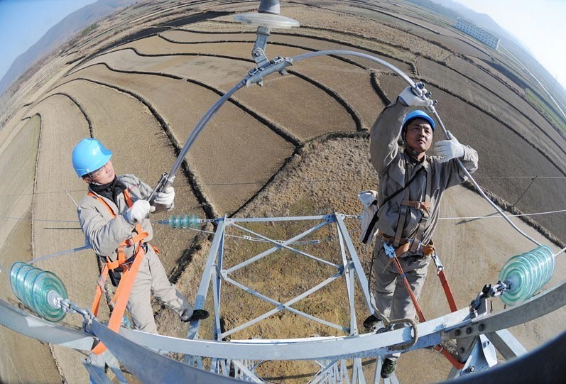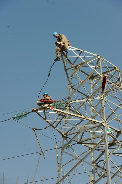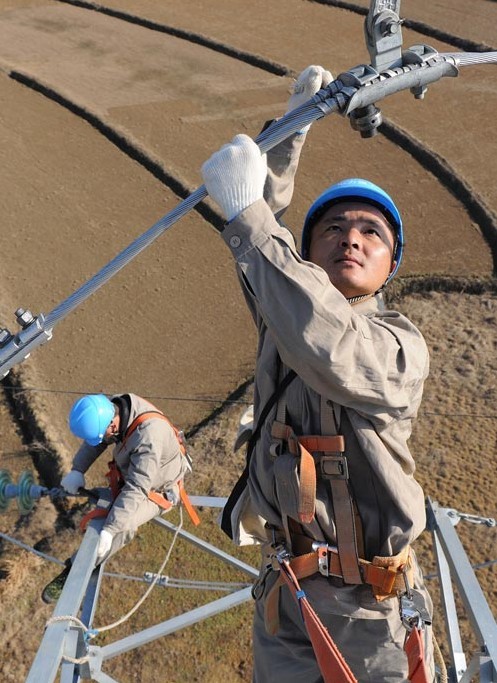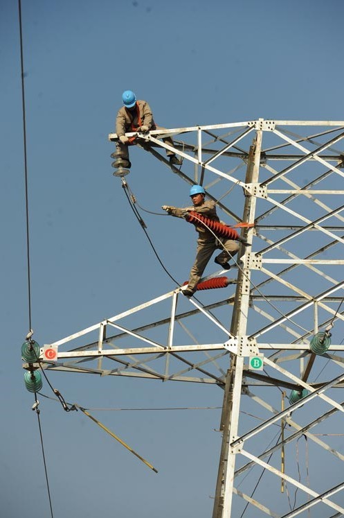 2013年1月18日,在安徽省滁州市珠龍鎮(zhèn)北關(guān)村,電力工人在高空對輸電線路進行技術(shù)改造。當日,安徽省滁州市迎來今冬用電日最高負荷128萬千瓦。面對新一輪冬季用電負荷高峰,保證電網(wǎng)安全運行,國家電網(wǎng)安徽省滁州供電公司提前制訂了巡檢重點線路和設(shè)備、開展電網(wǎng)反事故處置演練、加強電網(wǎng)運行值班和搶修力量等多項“迎峰度冬”保供電預(yù)案,并組織600余名技術(shù)人員利用晴好天氣對轄區(qū)供電設(shè)備和輸電線路進行全面檢查、維護,發(fā)現(xiàn)安全隱患及時處理,同時在全市部署極端氣候24小時故障快速搶修隊伍,確保轄區(qū)居民冬季用電安全。