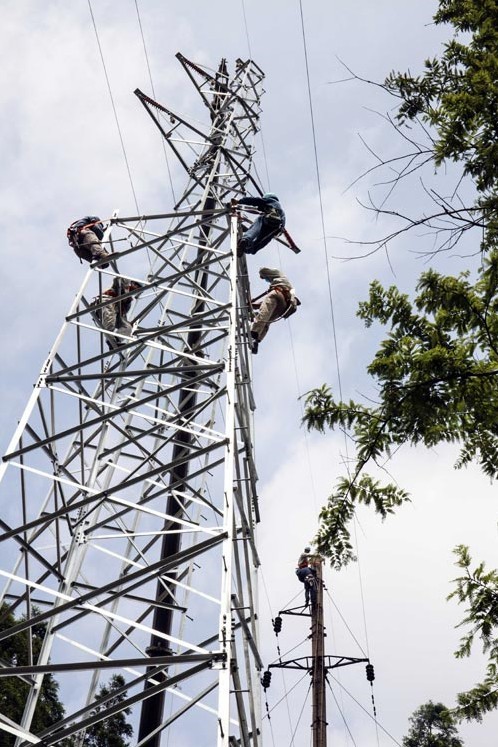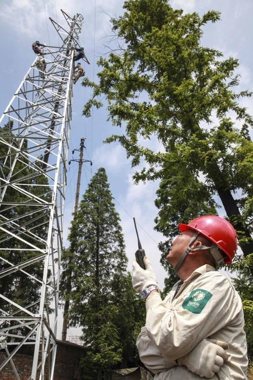 5月27日,江蘇泰州安泰輸變電工程有限公司工作人員正在35千伏口港線88號-90號改造現場組立鐵塔。 35千伏口港線工程肩負著泰州市高港區(qū)務港局和長江口岸閘口的供電任務。此線路已投運近20年,由于運行年限