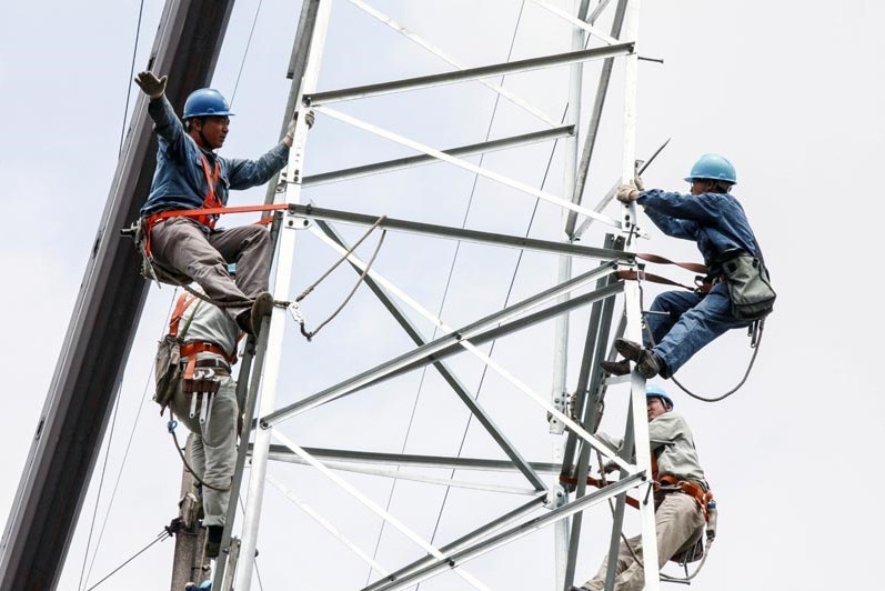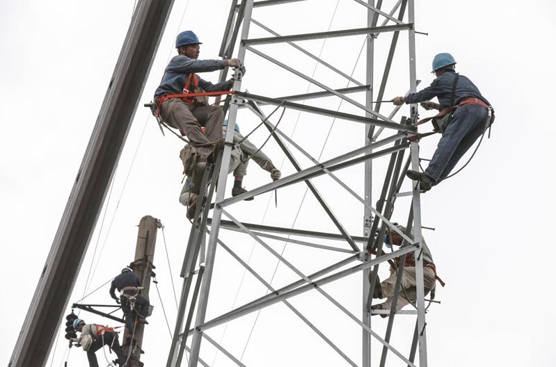 5月27日,江蘇泰州安泰輸變電工程有限公司工作人員正在35千伏口港線88號-90號改造現場組立鐵塔。