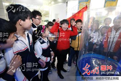 2014年4月22日,在河北省邯鄲市供電公司職工技術(shù)創(chuàng)新成果展示室,工作人員在輸電桿塔展示臺(tái)為聾啞學(xué)生講解電力知識(shí)。4月22日,河北省邯鄲市特殊教育學(xué)校的聾啞學(xué)生們走進(jìn)邯鄲市供電公司電力科普?qǐng)@、職工技術(shù)創(chuàng)新