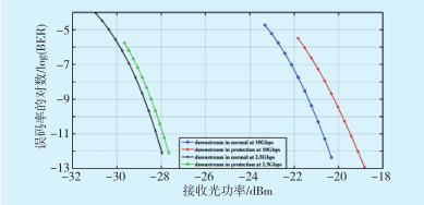 2種不同速率下的下行信號誤碼率(Bit-Error Rate,BER)曲線如圖8所示。在2.5 Gbps傳輸速率下,下行信號在正常與保護(hù)模式下有著非常近似的傳輸性能。當(dāng)誤碼率在10-9水平上時,信號的接收功率需要大約-28.5 dBm。而由保護(hù)模式所產(chǎn)生的額外性能損耗要小于0.3 dBm。而在10 Gbps的傳輸速率下,正常與保護(hù)模式之間的傳輸性能差異擴(kuò)大到了1.2 dBm。而在誤碼率為10-9情況下,2種模式下行信號所需要的最小接收功率分別為