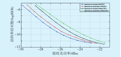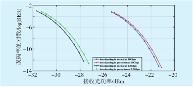 2.5 Gbps傳輸方案而言,在10-9的誤碼率水平上,信號所需要的最小接收功率在正常模式下為-28.7 dBm,而在保護(hù)模式下,則為-28.3 dBm。在2種模式間,有著0.4 dBm的額外性能損耗。而對于10 Gbps傳輸速率方案,在10-9的誤碼率水平上時,2種模式下的最小接收功率基本相同,皆為-22.5 dBm,也就是說,對于10 Gbps速率方案而言,共享保護(hù)模式對于廣播信號基本沒有影響。
