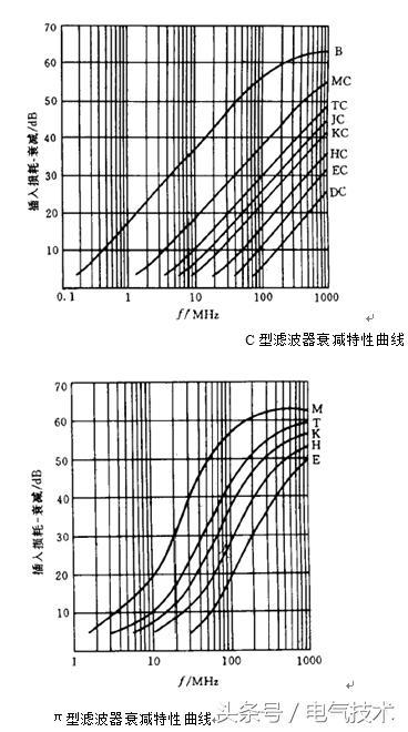 濾波器有高通、低通、帶通、帶阻等幾種,一般來(lái)說(shuō),EMI濾波連接器大都采用低通濾波器,即允許低于某一額定頻率的信號(hào)通過(guò),對(duì)于高于該額定頻率的信號(hào)則呈現(xiàn)很大的阻抗,這一頻率稱為截止頻率。濾波連接器按濾波形式劃分,主要有C型、π型、及LC型三種電路形式(見(jiàn)圖2),其中C型、π型最為常見(jiàn)。π型濾波性能優(yōu)于C型,它的插入損耗曲線陡度更大,即在給定的頻率和相等的電容下,π型濾波衰減大于C型(見(jiàn)圖3)。