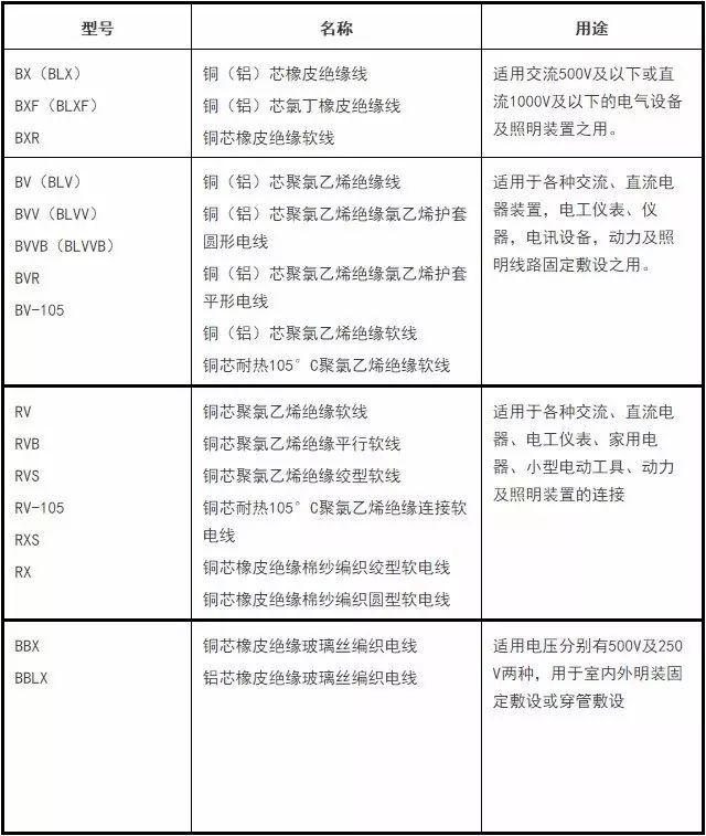 ②電線型號(hào):BV單股,BVR多股,BVV雙膠單股,BVVR雙膠多股;