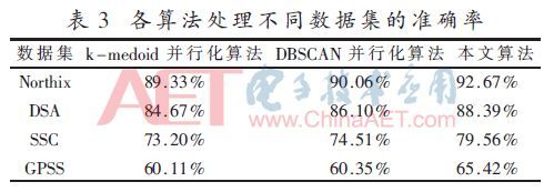 基于Northix、DSA、SSC和GPSS數(shù)據(jù)集使用5個(gè)線程實(shí)現(xiàn)算法的聚類準(zhǔn)確度比較見表3。