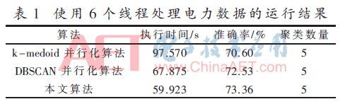 實(shí)驗(yàn)首先設(shè)置6個(gè)線程對數(shù)據(jù)集進(jìn)行處理,三種算法對電力數(shù)據(jù)進(jìn)行聚類的結(jié)果見表1。其中k-medoids并行化算法[8]采用標(biāo)簽共現(xiàn)原則對初始點(diǎn)選取進(jìn)行改進(jìn),但沒有考慮線程的分配方式,因此其執(zhí)行效率最差;DBSCAN算法考慮到了初始點(diǎn)的選取,并采用動態(tài)分配策略實(shí)現(xiàn)并行化,但在計(jì)算動態(tài)分配過程中增加了一定消耗,因此聚類準(zhǔn)確度和執(zhí)行效率都略有提升;本文所提出的算法,既考慮了初始點(diǎn)的合理選取,同時(shí)采用簡單有效的并行化分配策略,以減少計(jì)算和過多資源占用,因此相對于k-medoids并行化算法和DBSCAN并行化算法執(zhí)行效率大幅提升,準(zhǔn)確度也有所提高。