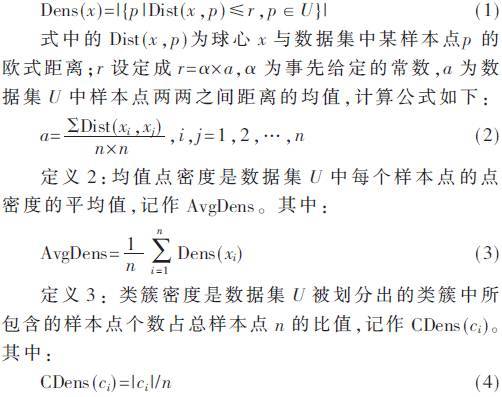 定義1:點(diǎn)密度是對于數(shù)據(jù)集U中的數(shù)據(jù)集的樣本點(diǎn)x,以x為球心,某一正數(shù)r為半徑的球形域中所包含樣本點(diǎn)的個(gè)數(shù),記作Dens(x)。其中: