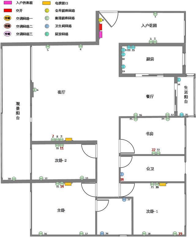 揭曉前,再普及一下回路的概念:簡單理解就是一個(gè)空氣開關(guān)(下圖黑色部分)可以控制的電路,含開關(guān)/照明、普通插座、空調(diào)插座等。下圖中空調(diào)都在各自獨(dú)立的回路中,所有照明在一個(gè)回路,插座分成了3個(gè)回路。