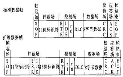 一個有效的數(shù)據(jù)幀由幀起始、仲裁場、控制場、數(shù)據(jù)場、校驗場、應答場和幀結束組成。CAN2.OB協(xié)議規(guī)定的兩種不同的幀格式,即標準格式和擴展格式,它們的主要區(qū)別在于仲裁場格式不同,標準幀的仲裁場由11位標識符和遠程發(fā)送請求位RTR組成。擴展幀的仲裁場由29位標識符和替代遠程請求SRR位、標志位和遠程發(fā)送請求位RTR組成。如圖1所示。