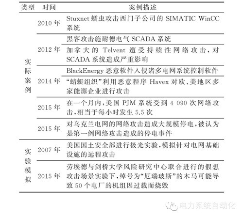 近年來,黑客或其他人員通過網(wǎng)絡(luò)攻擊手段侵入電網(wǎng)并最終實現(xiàn)對電力系統(tǒng)進行破壞的事件頻發(fā)(詳見表1)。各國政府也逐漸開始重視網(wǎng)絡(luò)攻擊對本國電力系統(tǒng)的影響, 并通過模擬攻擊對網(wǎng)絡(luò)安全進行自檢。針對電力系統(tǒng)的網(wǎng)絡(luò)攻擊一旦生效,將對系統(tǒng)穩(wěn)定、經(jīng)濟運行, 甚至國民生計、社會安定產(chǎn)生嚴重影響。美國國防部高級研究計劃局(DARPA)近期就啟動了一項名為“快速攻擊檢測、隔離和表征”的計劃,目標是發(fā)展一套能夠應對電網(wǎng)遭受針對信息網(wǎng)絡(luò)或基礎(chǔ)設(shè)施的摧毀性攻擊后7天內(nèi)恢復電力供應的自動化系統(tǒng)。