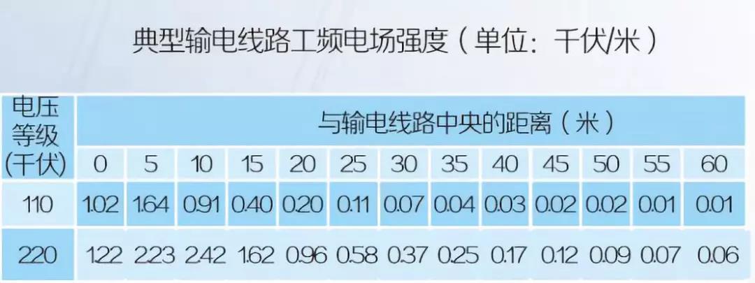 高壓線周邊工頻電場(chǎng)強(qiáng)度的大小主要取決于線路電壓的高低、線路導(dǎo)線的排列方式、截面積、導(dǎo)線對(duì)地高度和觀測(cè)點(diǎn)與導(dǎo)線的距離等。典型110千伏、220千伏輸電線路的工頻電場(chǎng)強(qiáng)度如下表所示。
