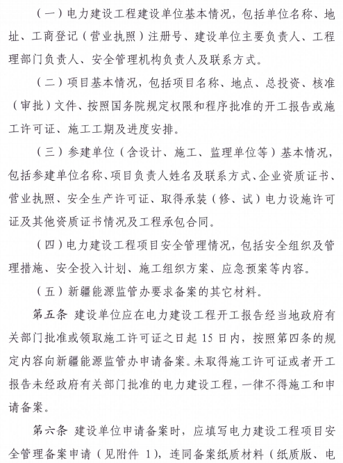 近日,新疆能監(jiān)局印發(fā)關(guān)于《新疆自治區(qū)電力建設(shè)工程安全管理備案實(shí)施細(xì)則》的通知,本細(xì)則適用于新疆境內(nèi)新建、擴(kuò)建、改建、拆除等電力建設(shè)工程的備案工作。本細(xì)則所稱電力建設(shè)工程,包括火電、水電、風(fēng)電、太陽能發(fā)電等發(fā)電建設(shè)工程,輸電、配電等電網(wǎng)建設(shè)工程及其他電力設(shè)施建設(shè)工程。5萬千瓦以下水電、分布式發(fā)電、企業(yè)自備機(jī)組及供熱供汽、余熱余壓發(fā)電、垃圾焚燒發(fā)電等按照國(guó)家相關(guān)規(guī)定另行執(zhí)行。
