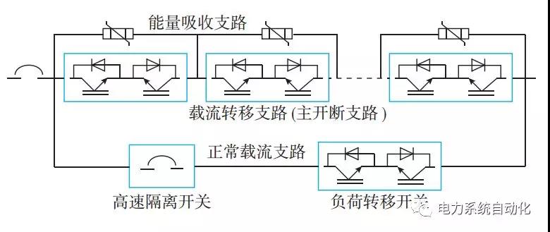 發(fā)生上述故障的概率是不可忽略不計(jì)的,因?yàn)樵谶m用于特高壓直流電網(wǎng)的混合式直流斷路器中,需要串聯(lián)多個如圖2所示的開斷模塊,而每個開斷模塊中又含有多個串聯(lián)的分元件,若其中的某一分元件出故障,均有可能導(dǎo)致在開斷直流網(wǎng)絡(luò)短路電流的過程中,出現(xiàn)電子元器件因局部過電壓被擊穿的問題。譬如,如果圖2所示的載流轉(zhuǎn)移支路中的某一分元件因故障不能正常導(dǎo)通分流,則負(fù)荷轉(zhuǎn)移開關(guān)很可能被自身關(guān)斷過程中出現(xiàn)的截流過電壓擊穿,從而導(dǎo)致高速隔離開關(guān)也不能正常打開;即使上述過程沒出問題,載流成功轉(zhuǎn)移到圖2所示的主開斷支路后,如果主開斷支路在其斷流過程中部分元件出故障未同時關(guān)斷,也可能導(dǎo)致其余的分元件在其關(guān)斷過程中因分擔(dān)過高的截流過電壓而被擊穿。此外,高速隔離開關(guān)還可能因機(jī)械故障而不能打開,從而導(dǎo)致直流斷路器不能成功斷流。綜上所述,特高壓直流斷路器拒動或開斷直流電網(wǎng)短路電流不成功事件的概率,不像交流三相斷路器同時拒動事件的概率那樣可以忽略不計(jì)。
