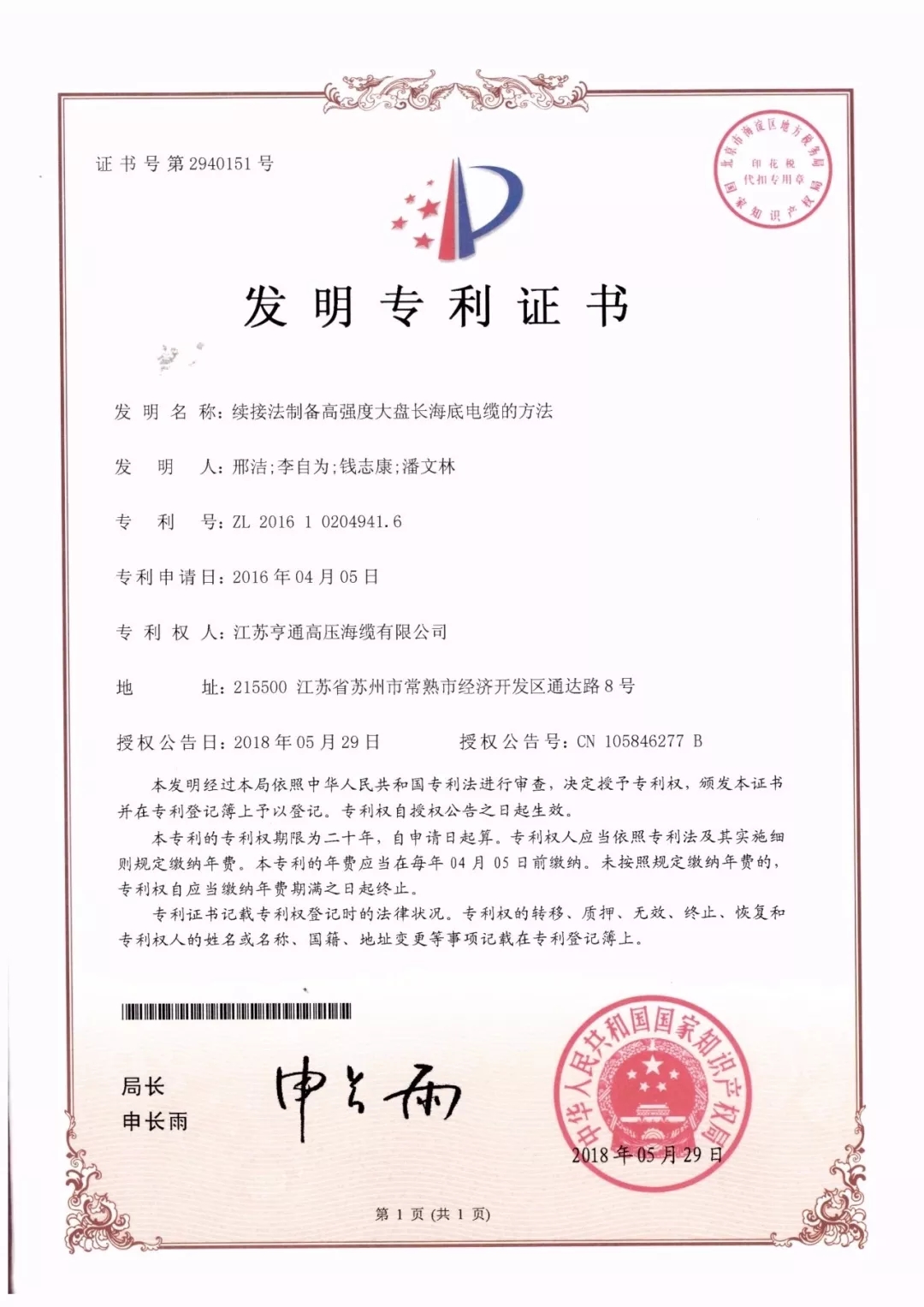 近日,亨通電力產(chǎn)業(yè)集團(tuán)旗下江蘇亨通高壓海纜有限公司的續(xù)接法制備高強(qiáng)度大盤長海底電纜的方法、一種采用非正規(guī)絞合的海底電纜異型導(dǎo)體與江
