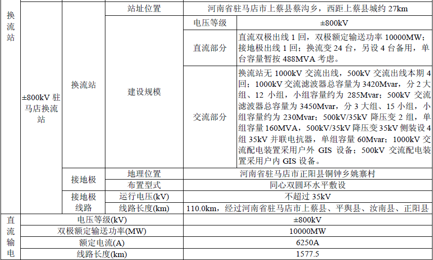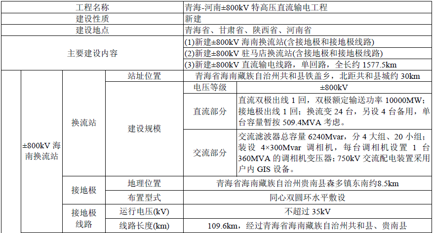 本工程建設(shè)內(nèi)容包括:新建送端±800kV海南換流站(含接地極和接地極線路,以下簡稱“海南換流站”)、新建受端±800kV駐馬店換流站(含接地極和接地極線路,以下簡稱“駐馬店換流站”)、新建青海-河南±800kV直流輸電線路(以下簡稱“直流輸電線路”)約1577.5km。