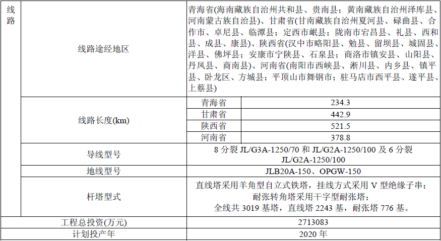 本工程直流輸電線路起于青海省境內(nèi)的海南換流站,止于河南省境內(nèi)的駐馬店換流站,總長約1577.5km,采用單回雙極架設(shè)。途經(jīng)青海省(海南藏族自治州、黃南藏族自治州)、甘肅省(甘南藏族自治州、定西市、隴南市)、陜西省(漢中市、安康市、商洛市)、河南省(南陽市、平頂山市、駐馬店市),共4個(gè)省級(jí)行政區(qū),11個(gè)地市級(jí)行政區(qū),37個(gè)縣級(jí)行政區(qū)。其中,青海省境內(nèi)全長約234.3km,甘肅省境內(nèi)全長約442.9km,陜西省境內(nèi)全長約521.5km,河南省境內(nèi)全長約378.8km。