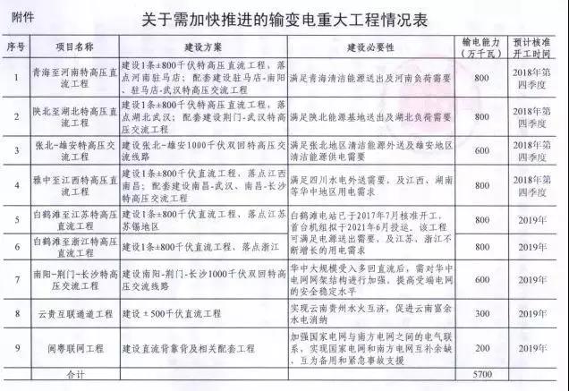 為加大基礎(chǔ)設(shè)施領(lǐng)域補(bǔ)短板力度,發(fā)揮重點(diǎn)電網(wǎng)工程在優(yōu)化投資結(jié)構(gòu)、 清潔能源消納、電力精準(zhǔn)扶貧等方面的重要作用,加快推進(jìn)白鶴灘至江蘇、白鶴灘至浙江特高壓直流等9項(xiàng)重點(diǎn)輸變電工程建設(shè)。項(xiàng)目包括了12條特高壓工程,合計(jì)輸電能力5700萬(wàn)千瓦,將于今明兩年給予審核。