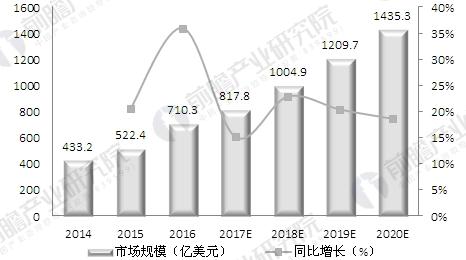 2014-2020年全球云計算市場規(guī)模及預(yù)測(單位:億美元,%)