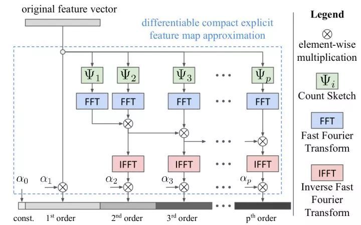 (2) 近似核估計。可以證明,在雙線性匯合結(jié)果后使用線性SVM分類等價于在描述向量間使用了多項(xiàng)式核。由于兩個向量外積的映射等于兩個向量分別映射之后再卷積,有研究工作使用隨機(jī)矩陣近似向量的映射。此外,通過近似核估計,我們可以捕獲超過二階的信息(如下圖)。