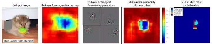 遮擋實(shí)驗(yàn)(occlusion experiment) 用一個灰色方塊遮擋住圖像的不同區(qū)域,之后前饋網(wǎng)絡(luò),觀察其對輸出的影響。對輸出影響最大的區(qū)域即是對判斷該類別最重要的區(qū)域。從下圖可以看出,遮擋住狗的臉對結(jié)果影響最大。