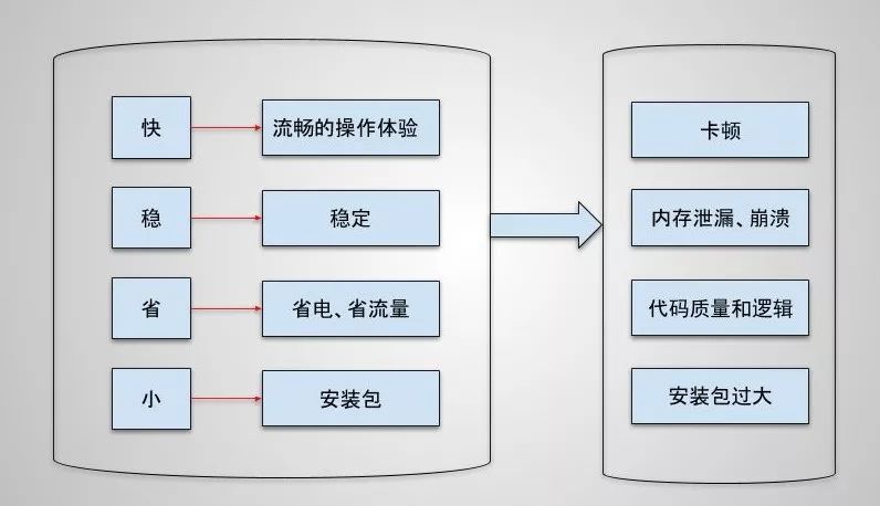 從圖中可以看到,打造一個高質(zhì)量的應(yīng)用應(yīng)該以4個方向為目標(biāo):快、穩(wěn)、省、小。