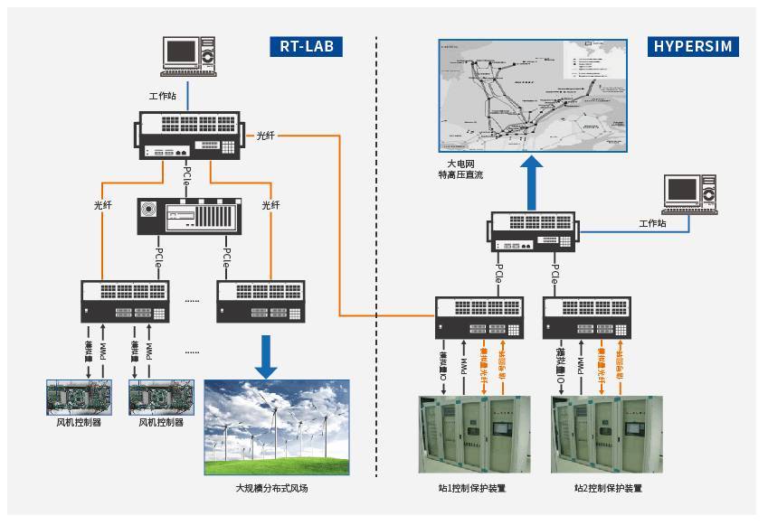 該系統(tǒng)方案結(jié)合了科梁公司RT-LAB及Hypersim兩大旗艦實時仿真平臺的優(yōu)勢,其中借助HyperSim強大的大規(guī)模電力系統(tǒng)仿真能力和優(yōu)勢以仿真?zhèn)鹘y(tǒng)直流及特高壓直流輸電,而借助RT-LAB特有及專業(yè)的電力電子仿真能力模擬大規(guī)模分布式風電場,考慮合適的解耦位置,兩者通過高速光纖通訊進行自然解耦,從而完成大規(guī)模分布式風力發(fā)電經(jīng)直流外送并入大電網(wǎng)場景的精準而有效的實時仿真模擬,開展系統(tǒng)級的關(guān)鍵技術(shù)問題研究。