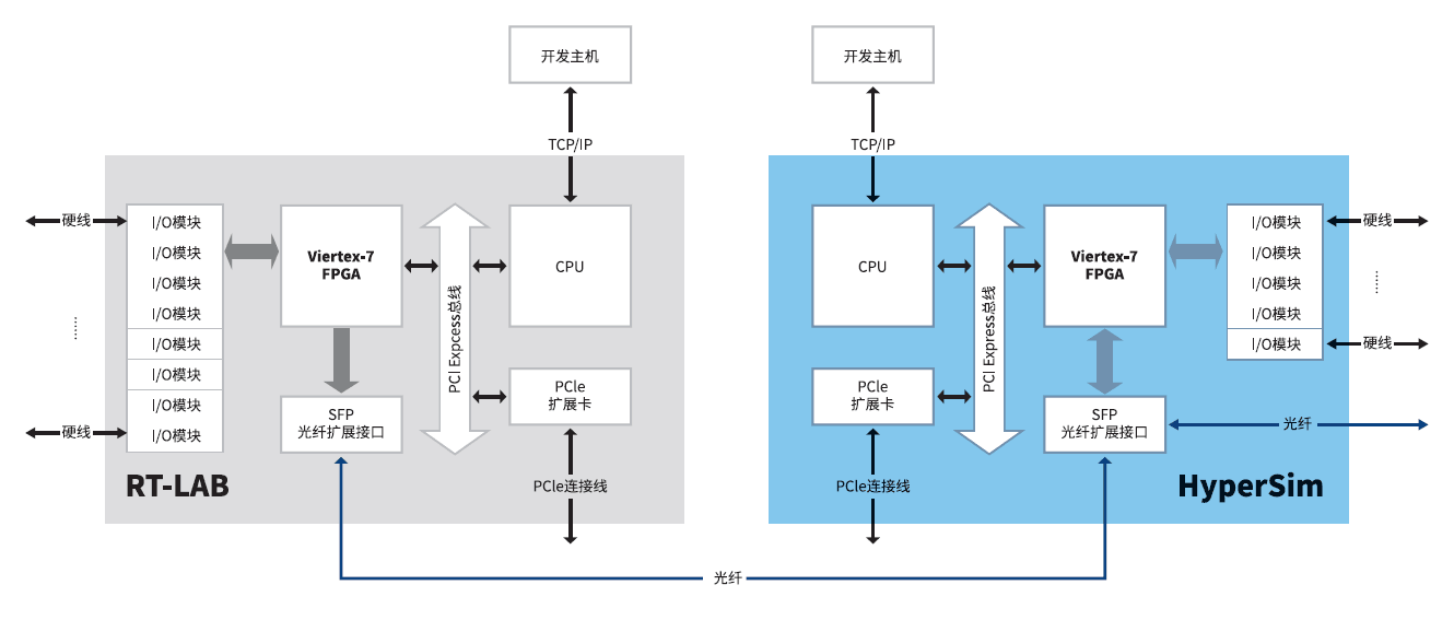該系統(tǒng)分為RT-LAB及Hypersim兩大仿真平臺,各個仿真平臺主要包括多核CPU、多FGPA擴展及開發(fā)主機。其中CPU為主要的計算單元,可以完成較大規(guī)模新能源風場模型、傳統(tǒng)直流及特高壓直流模型的計算、CAN通訊、串口通訊、TCP/IP、IEC61850通訊等多種不同的通訊實現(xiàn),而FPGA具備高速的硬件計算能力,主要負責一些高精度的模型計算、高速的IO及光纖通訊管理,CPU與FPGA采用了高速的PCIe總線進行實時的通訊,同時也可以通過該總線擴展一些PCIe擴展裝置。各自的開發(fā)主機則完成不同平臺的模型開發(fā)、離線驗證、實驗管理、數(shù)據(jù)管理及模型運行監(jiān)控等。
