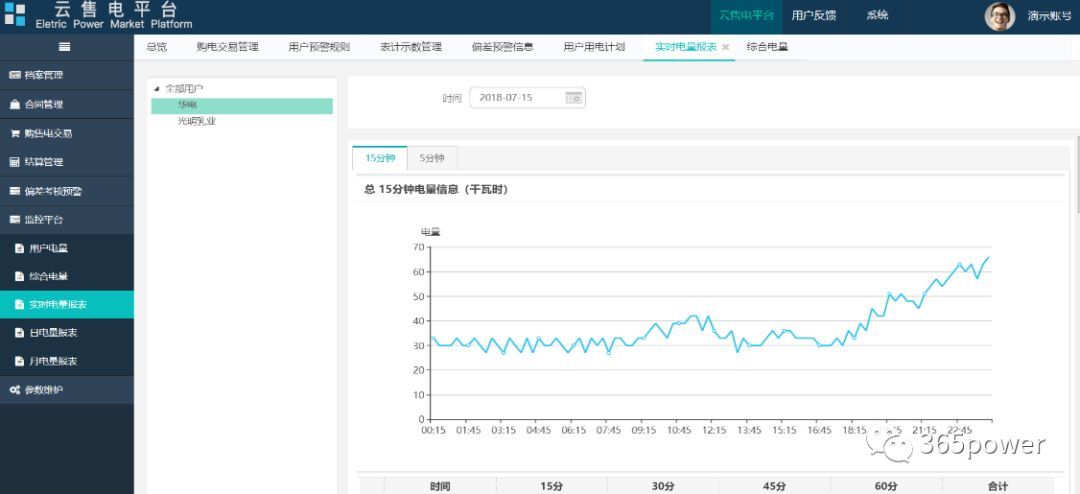 實(shí)時(shí)監(jiān)控用戶的用電情況,以報(bào)表曲線的形式直觀監(jiān)控用戶峰、平、谷的電量信息并為開展現(xiàn)貨市場提供了更精準(zhǔn)的數(shù)據(jù)依據(jù)。