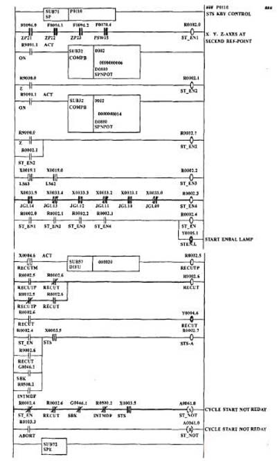 按照前面的設(shè)計思路,在數(shù)控機床PMC程序中增加P110子程序,生成R2.7(STS.A);其中循環(huán)啟動準(zhǔn)備好指示燈信號輸出點為y15.1,返修鍵信號輸入點為X4.6,返修指示燈信號輸出點為Y4.6。相應(yīng)的梯形圖如圖1示。