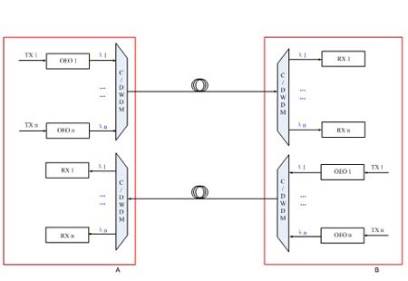 1) 在網(wǎng)絡(luò)的接入層,由于接入節(jié)點(diǎn)數(shù)量眾多,位置分散,速率相對不高,比較經(jīng)濟(jì)有效的解決方案是采用基于CWDM或DWDM技術(shù)的小型化波分方案。該方案采用開放式、模塊化、可熱插拔的設(shè)備設(shè)計(jì)方式,集成可實(shí)現(xiàn)ITU規(guī)定的波分系統(tǒng)標(biāo)準(zhǔn)波長轉(zhuǎn)換功能的光收發(fā)模塊,配備無源合波、解波器,可按照需求靈活配置最多16路的CWDM波長,以及最多48路的DWDM波長信號,并可實(shí)現(xiàn)單模多模信號之間的轉(zhuǎn)換。圖1為CWDM/DWDM小型化波分方案的示意圖。