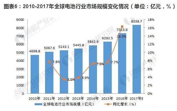 首先,全球電池行業(yè)將持續(xù)回暖。隨著全球經(jīng)濟(jì)逐步復(fù)蘇,下游市場(chǎng)需求釋放,全球電池行業(yè)有望實(shí)現(xiàn)中高速增長(zhǎng)。據(jù)前瞻產(chǎn)業(yè)研究院《2018-2023年中國(guó)電池行業(yè)市場(chǎng)需求預(yù)測(cè)與投資戰(zhàn)略規(guī)劃分析報(bào)告》數(shù)據(jù)顯示,2016年,全球電池行業(yè)市場(chǎng)規(guī)模達(dá)到7315.6億元,同比增長(zhǎng)了16.3%,回暖趨勢(shì)明顯。