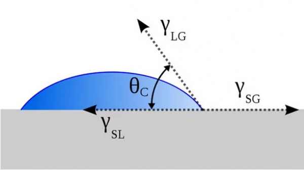 在這個(gè)過程中,會(huì)涉及到物理化學(xué)中的一個(gè)概念“接觸角”(潤(rùn)濕角)。如下圖所示,圖中藍(lán)色區(qū)域代表液體,灰色區(qū)域代表固體界面。那么藍(lán)色與灰色接觸的區(qū)域則是固液相接觸界面,液體的切線與固體界面交叉的位置形成了一個(gè)角度θ,其中接觸角θ越小說明電解液對(duì)極片或隔膜的浸潤(rùn)性越好。