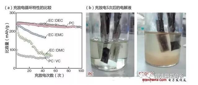 東京理科大學(xué)通過將PC和EC:DEC用于電解液,實現(xiàn)了充放電循環(huán)特性出色的鈉離子充電電池,并于2009年春進(jìn)行了相關(guān)發(fā)表(a)。如果是鋰離子充電電池利用的EC:DMC的話,電解液立即就會劣化(b)。