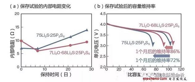 豐田確認(rèn),作為全固體電池的固體電解質(zhì),具備高耐水性的75Li2S˙25P2S5在60℃的保存試驗中,內(nèi)部抵抗難以上升(a)。試制充電電池測量容量變化時發(fā)現(xiàn),1個月后保持了86%的容量(b)。(圖由《日經(jīng)電子》根據(jù)豐田的資料制作)