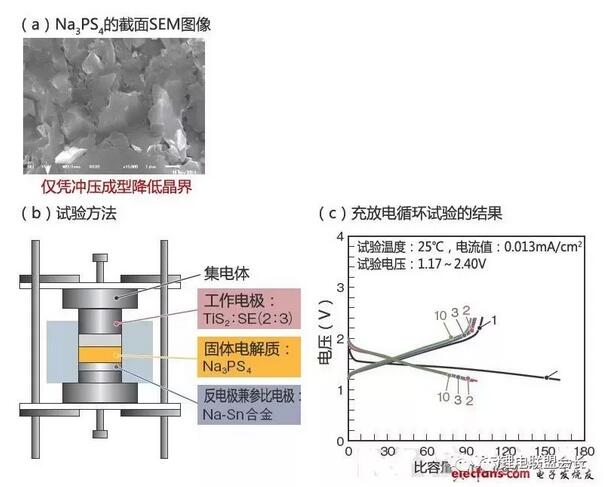 大阪府立大學(xué)在電池研討會上就固體電解質(zhì)采用Na3PS4的全固體電池發(fā)表了演講(a,b)。與初始放電容量相比,第二次以后的放電容量大幅降低,不過第二次以后表現(xiàn)出了穩(wěn)定的循環(huán)特性(c)。