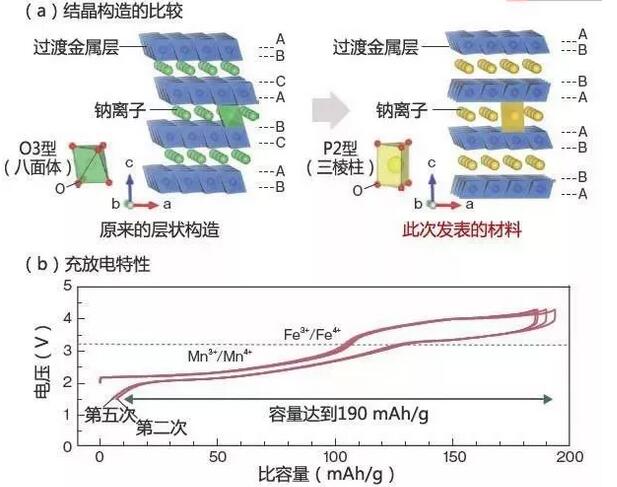 僅以鐵構(gòu)成的NaFeO2一般采用鈉和氧形成八面體網(wǎng)格的O3型積層構(gòu)造,以3.5V以上電壓充電時,隨著鐵離子的移動會發(fā)生不可逆相變。而P2型Na2/3(Fe1/2Mn1/2)O2即使充電電壓超過3.5V,也可以根據(jù)鐵的氧化還原反應(yīng)獲得可逆容量,充電電壓提高至4.5V時仍能維持層狀構(gòu)造。