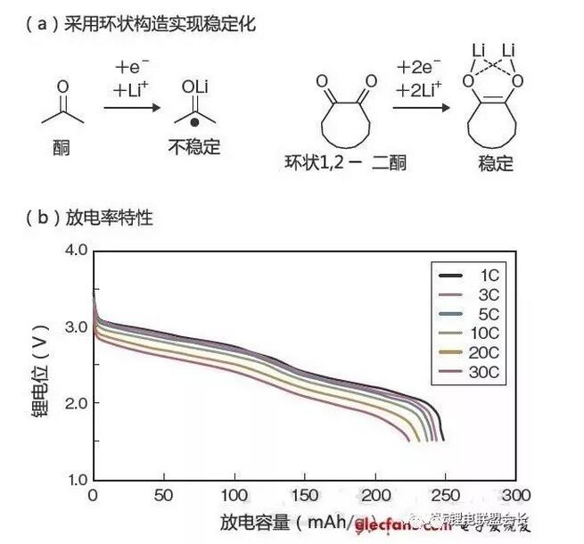 京都大學(xué)和松下開發(fā)出了正極材料采用將兩個酮連接形成環(huán)狀構(gòu)造的環(huán)狀1,2-二酮的有機充電電池(a)。支持30C的高速充放電(b)。