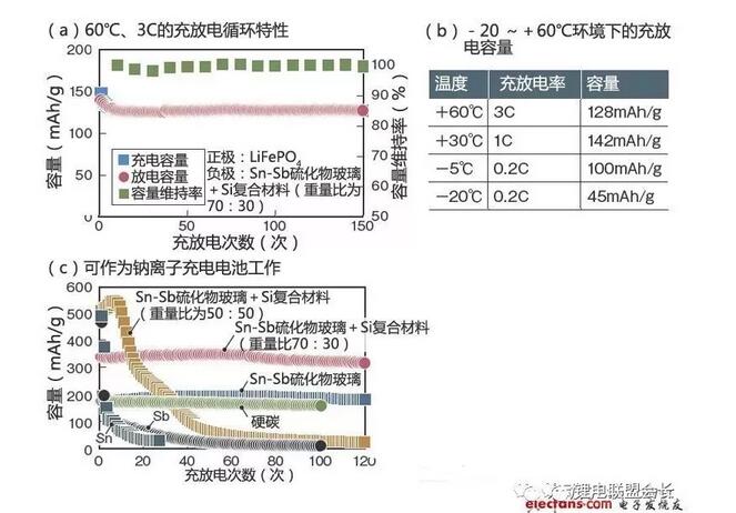 五鈴精工硝子開發(fā)出了經(jīng)過150次循環(huán)充放電后實現(xiàn)99%的容量維持率的鋰離子充電電池(a)??稍?20~+60℃的大溫度范圍內(nèi)使用(b)。特點是負(fù)極材料采用了Sn-Sb硫化物玻璃,還可用于鈉離子充電電池(c)。