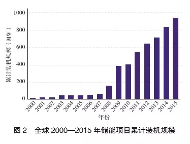 截至2015年底,全球累計(jì)運(yùn)行儲(chǔ)能項(xiàng)目(不含抽水蓄能、壓縮空氣和儲(chǔ)熱)327個(gè),裝機(jī)規(guī)模從2005年50MW增長到2015年950MW,規(guī)劃和在建項(xiàng)目180個(gè)(圖2)。