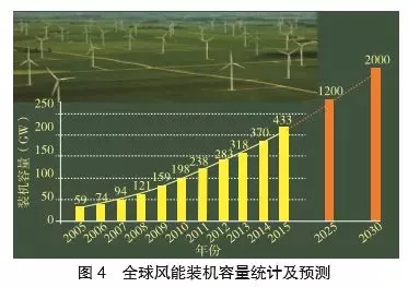 統(tǒng)計(jì)過去20年太陽能、風(fēng)能裝機(jī)容量,太陽能裝機(jī)容量每兩年翻一番,風(fēng)能裝機(jī)容量每4年翻一番,全球太陽能裝機(jī)容量從2005年的5.1GW增長到2015年的227GW,風(fēng)能裝機(jī)容量從2005年的59GW增長到2015年的433GW。預(yù)計(jì)2025年、2030年太陽能裝機(jī)容量將分別達(dá)到1500GW、2400GW,同期風(fēng)能裝機(jī)容量將分別達(dá)到1200GW、2000GW(圖3、圖4)。儲(chǔ)能技術(shù)作為支撐可再生能源并網(wǎng)的關(guān)鍵技術(shù),市場潛力巨大。