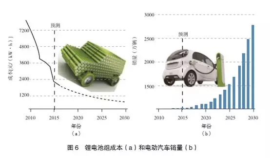 電動(dòng)汽車電池成本目前占整車成本的1/3~1/2,過去5年鋰電池組成本已下降了55%,至2020年有望再下降40%。隨著電動(dòng)汽車電池能量密度提高帶來的續(xù)航里程增加,加之成本不斷下降,全球電動(dòng)汽車銷量有望呈指數(shù)上升(圖6)。