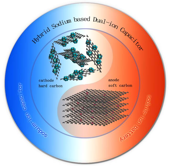 基于以上的問題,在魯兵安教授的指導下,陳素華博士提出了一種新型的混合鈉雙離子電容器,用氮摻雜的硬碳和軟碳分別作為電容器的正負極。由于氮摻雜的硬碳獨特的微觀結(jié)構(gòu),使其具有優(yōu)異的儲存六氟磷根離子(陰離子)的性能?;旌镶c雙離子電容器結(jié)合的電池和電容器的優(yōu)點,具有超高的能量密度和功率密度,開辟了雙碳電極在鈉雙離子電容中的應用。