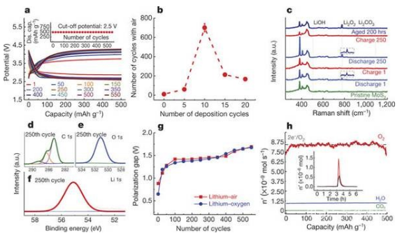 近日,在伊利諾伊大學芝加哥分校Amin Salehi-Khojin教授和阿貢國家實驗室Larry A. Curtiss教授(共同通訊作者)的團隊帶領(lǐng)下,與伊利諾伊理工大學和加利福尼亞州立大學合作,采用了兩種策略來限制在含有代表性量的O2,N2,CO2和H2O的模擬空氣氛圍中的鋰-氧電池中的副反應(yīng)。首先,團隊開發(fā)了Li2CO3/C涂層鋰陽極僅允許鋰陽離子通過,從而保護陽極免受模擬空氣的成分影響。其次,基于先前報道的二硫化鉬納米薄片構(gòu)建陰極,并使用離子液體1-乙基-3-甲基咪唑四氟硼酸鹽(EMIM-BF4)和二甲基亞砜(DMSO)的混合物作為電解質(zhì)。該系統(tǒng)的組件一起運行,以防止在CO2和H2O存在下形成副產(chǎn)物。在模擬空氣環(huán)境中作為鋰空氣電池工作,循環(huán)壽命長達700次。相關(guān)成果以題為“A lithium–oxygen battery with a long cycle life in an air-like atmosphere”發(fā)表在了Nature上。
