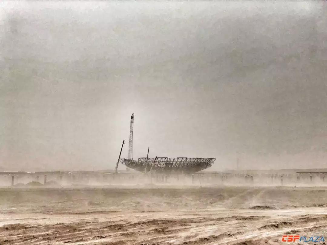 這不是科幻電影,這是在建的玉門鑫能50MW二次反射熔鹽塔式電站的建設(shè)場景(下圖),當(dāng)天,沙塵暴侵襲了該項目地。這只是在中國西部建設(shè)光熱